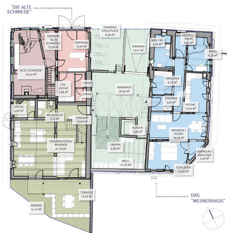 Erschlossen wird der Gewerbeteil, sowie die „Alte Schmiede“ weiterhin von der Linsenhofer-Straße. Die Wohnungen werden über den neuen Innenhof mit Treppenturm, zwischen der Linsenhofer-Straße 5 und 7 erschlossen.